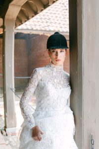 Reem Acra high neck lace wedding gown with riding cap by Sarah Bradshaw